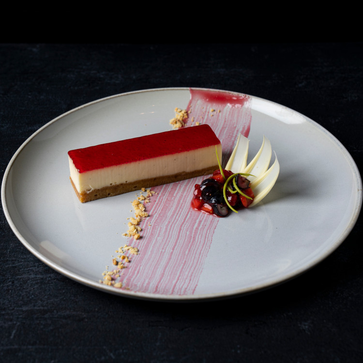 Bodem van boterkoekkruimels,gebakken cheesecake op basis van crème fraiche met cassis gelei.