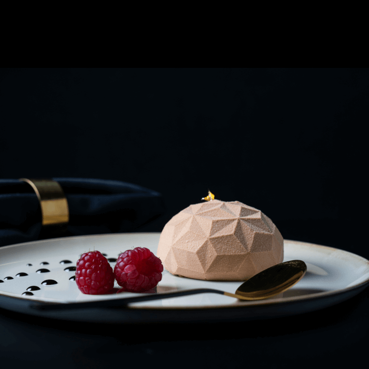 De trend van het moment. Een geometrische diamant vorm van chocolade. Een bodem van bretonse koek, een compote van frambozen, een mousse van melk chocolade en een luxe decoratie van eetbaar bladgoud. Deze chocolate diamond is van een heel nieuwe niveau. Verfijnd tot in het kleinste detail en..... ontworpen om te verbluffen.