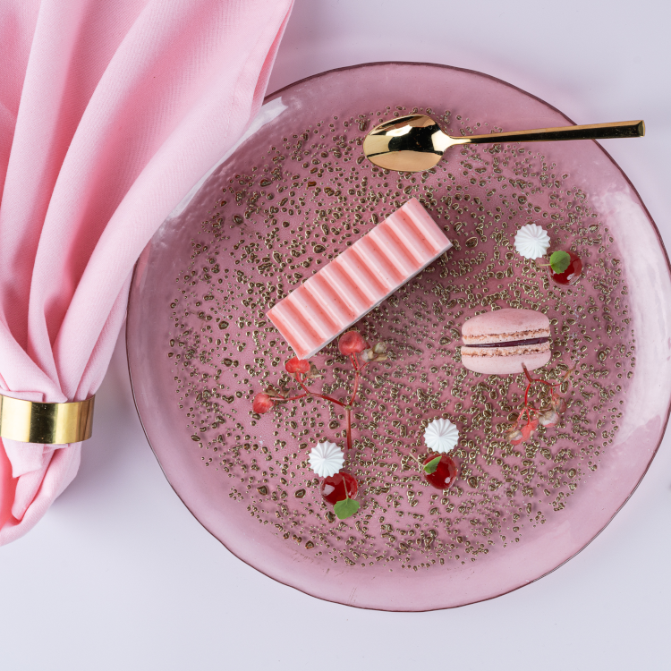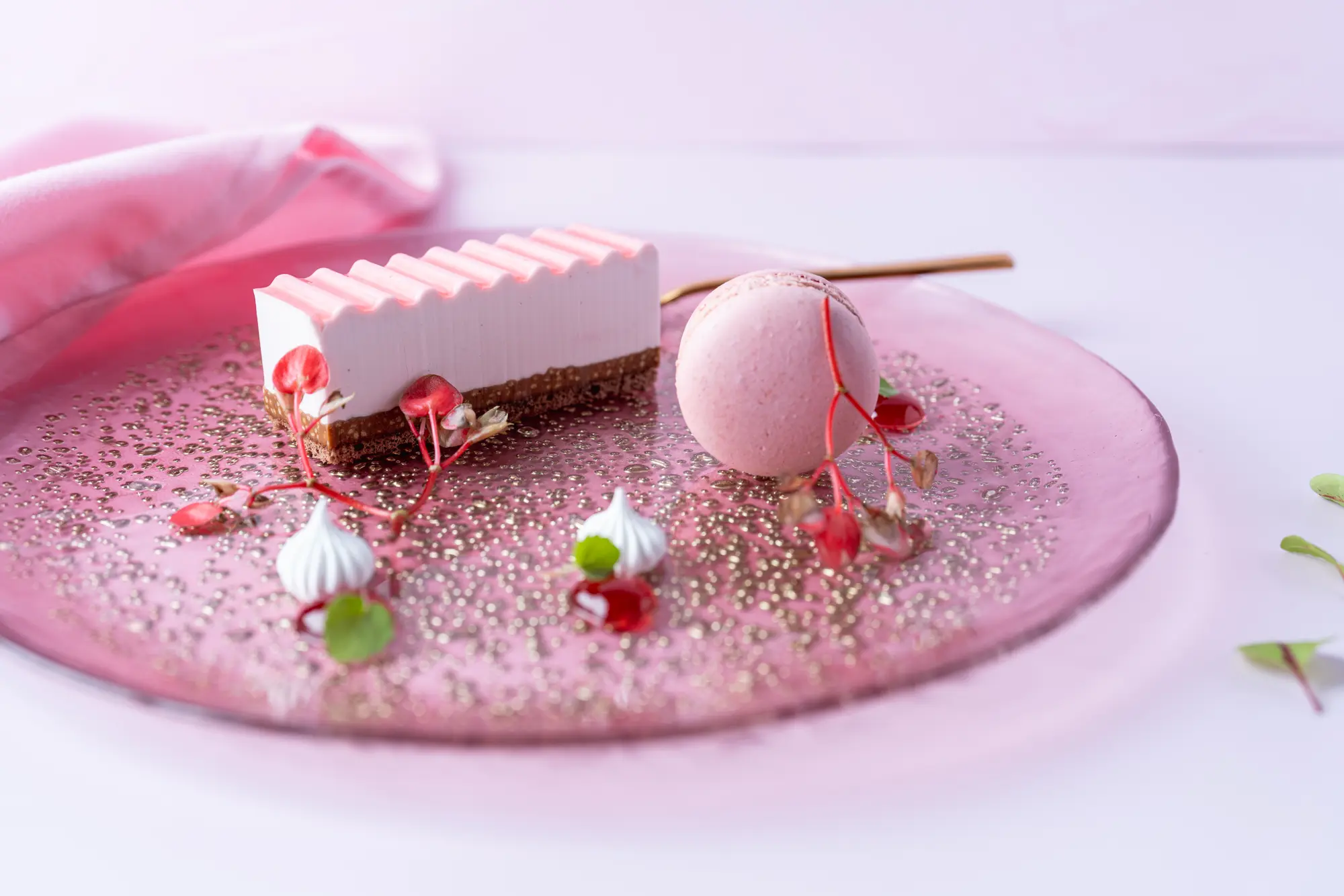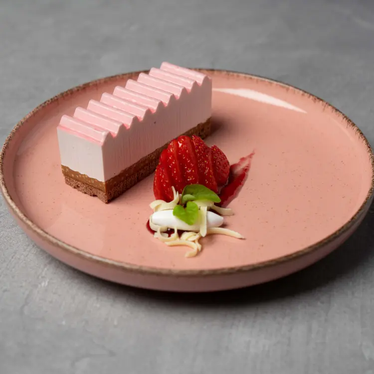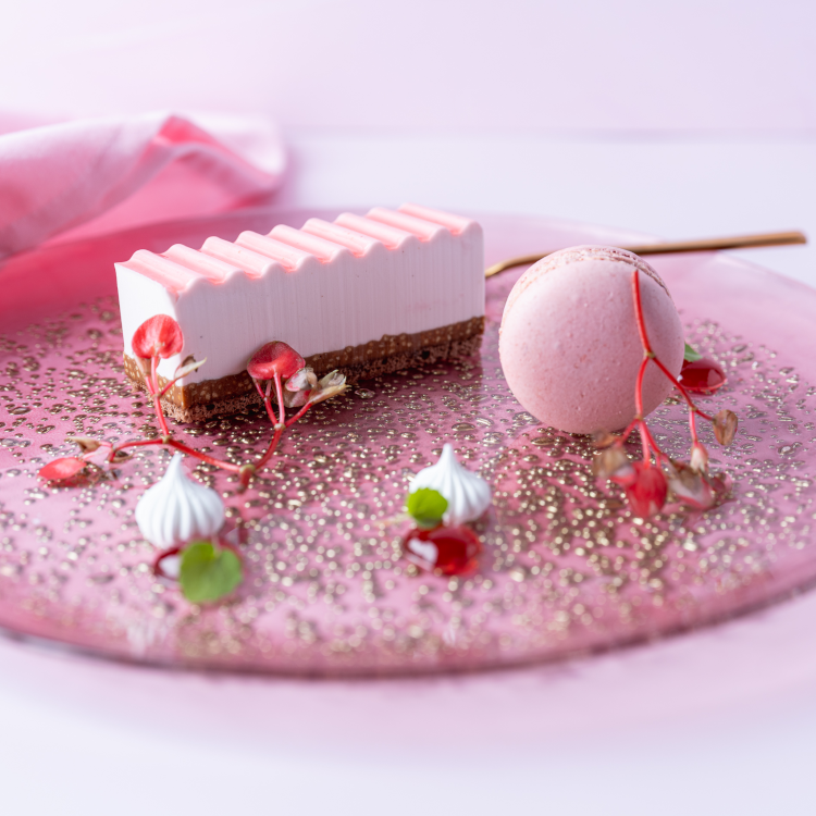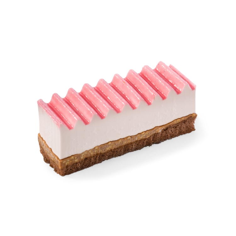 Aardbei bavarois met chocolade biscuit met krokante karamel melkchocolade en aardbei gelei.