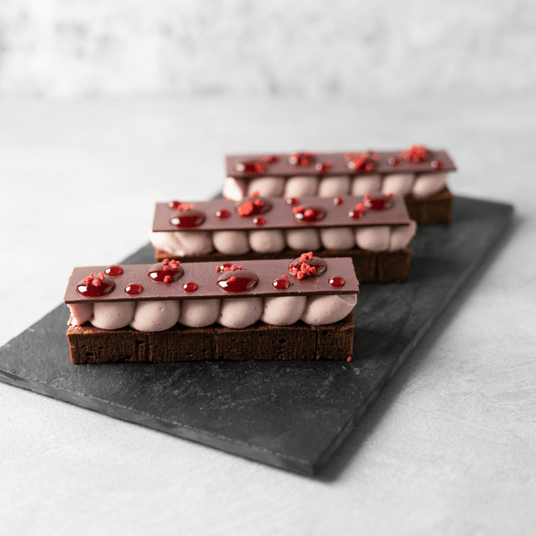 Donkere chocolade cake met frambozenstukjes, opgespoten met frambozenroom , gedecoreerd met een plak pure chocolade, frambozengelei.