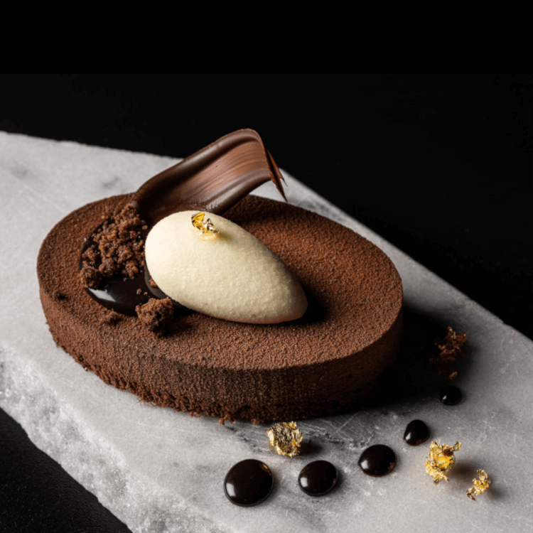 Luxe dessert van drie soorten Callebaut chocolade: melk, wit en pure chocolade op een bodem van chocolade amandel biscuit met nootjes. Gedecoreerd met een quenelle van witte chocolade room, een gekrulde vinger-galette, chocolade gelei, crumble en eetbaar bladgoud. Met deze triple van chocolade haalt u een echte hardloper in huis.