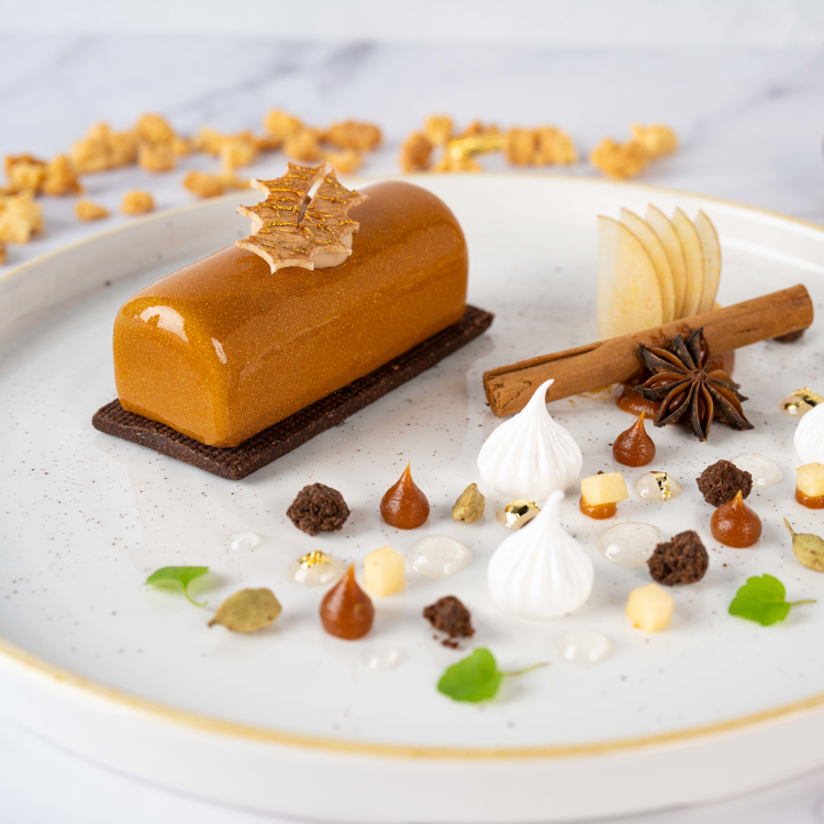Dit luxe Kerstdessert staalt als goud, met de warme smaken van chai specerijen in een romige mousse, verrijkt met een karamel – appel compote. Gezet op een decadente donkere chocoladebodem en afgewerkt met een elegante gouden chocolade hulstblad. Een gouden traktatie voor de feestdagen!