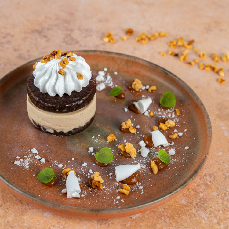 Een luchtige klassieker in een nieuw jasje: hazelnoot roomijs en meringue schuim omhuld door chocolade. Ideaal als ijs dessert of als feestelijk ijstaartje!