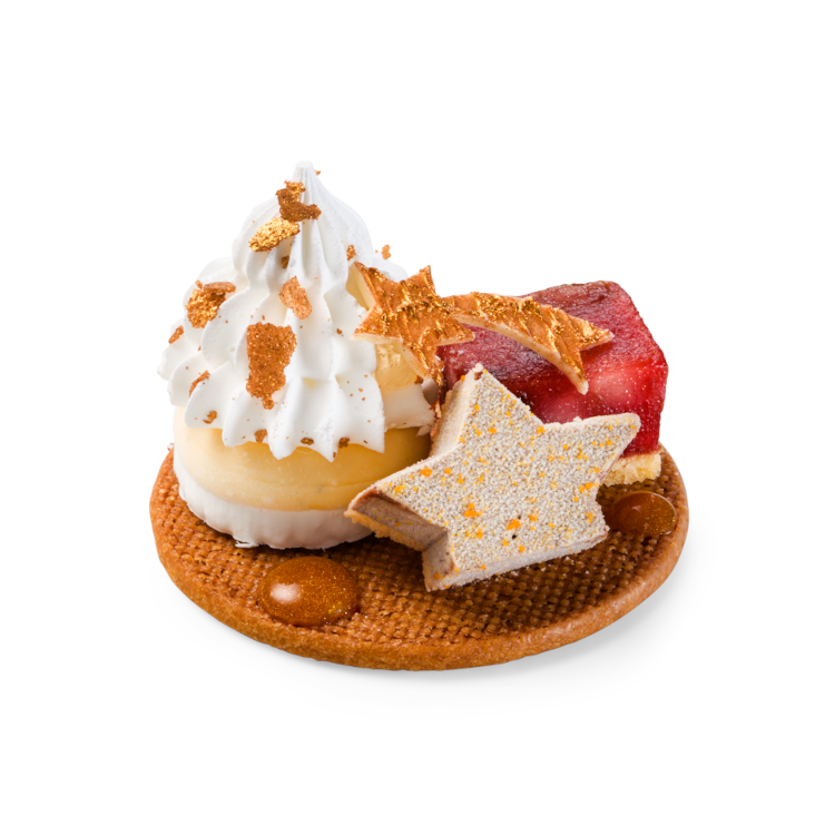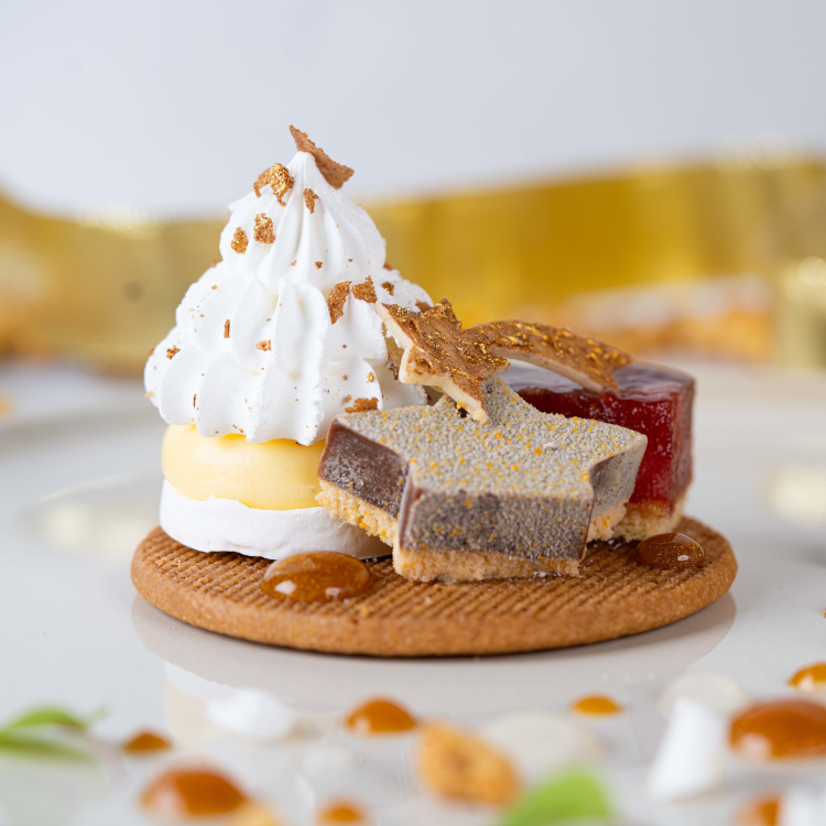 Een feestelijk kerstdessert met een stervormige panna cotta van kaneel, een merengue kerstboompje gevuld met vanillecréme en een blokje stoofpeercompote. Gezet op een krokante bodem van bretonse kaneel. afgewerkt met gouden gelei en een schitterende gouden sterdecoratie – een stralend meesterwerk voor de feestdagen.