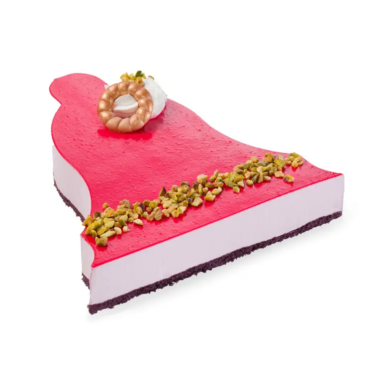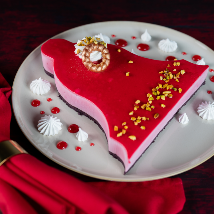 Een kerstklok van bosvruchten bavarois op een bodem van cassissmaak biscuit. De taart is feestelijk gedecoreerd met frambozen gelei en een chocolade Kerst decoratie. Leverbaar vanaf 17-11-2025.