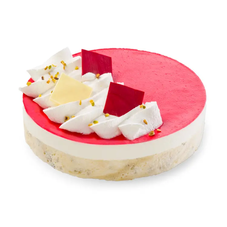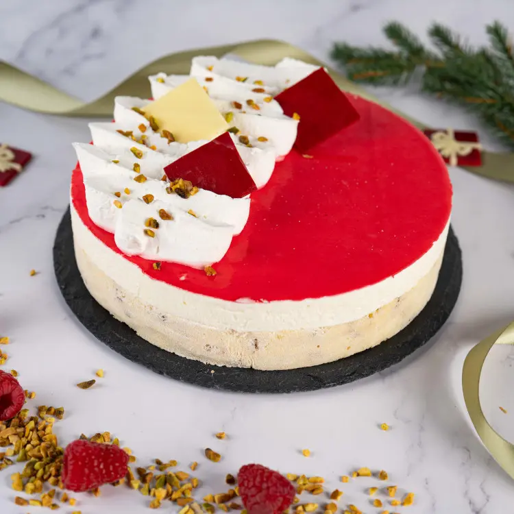 Een elegante taart voor de feestdagen, opgebouwd uit luchtige amandelbavaroise en een zachte pistachebiscuit, met een frisse frambozengelei als fruitige verrassing. Afgewerkt met krokante pistachenootjes en witte en rode chocolade decoratie. Een stijlvolle afsluiter voor elke feesttafel.