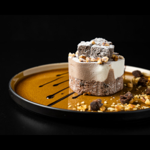 Chocolade roomijs met amandel smaak, gedecoreerd met brownie stukjes en gekarameliseerde stukjes hazelnoot.