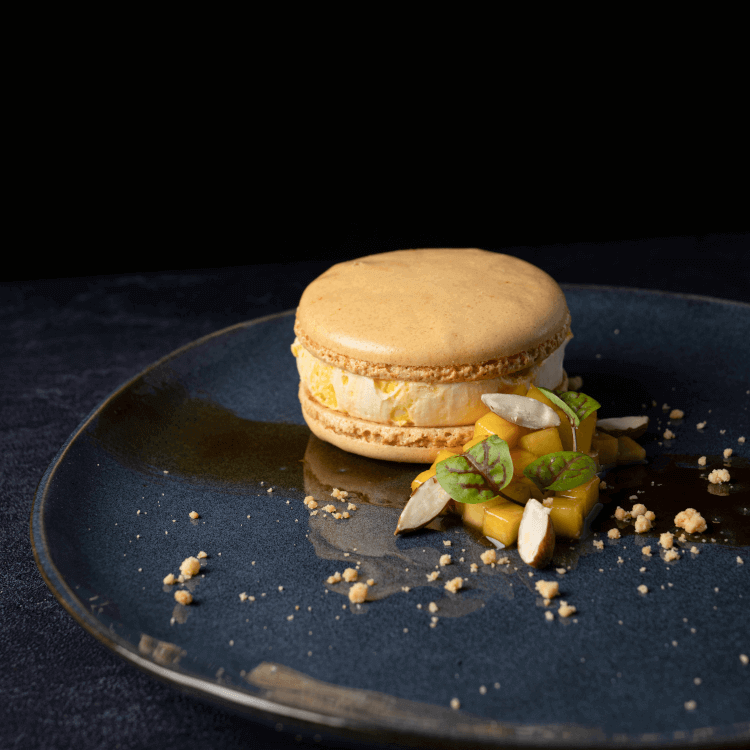 DE ijsvariant van de klassieke macaron, roomijs met een swirl van mango-passie sorbet.