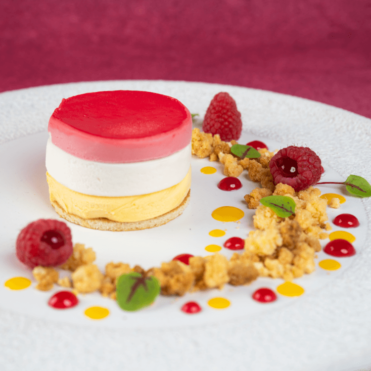 Frisse laagjes sorbetijs in de smaken mango, citroen en framboos.