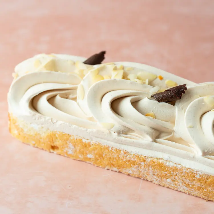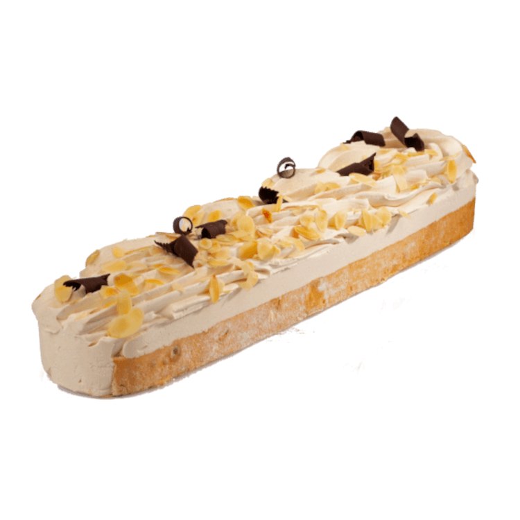 Appeltaart bavarois, naturel biscuit, rijkelijk gedecoreerd met gebruneerde amandelschaafsel.