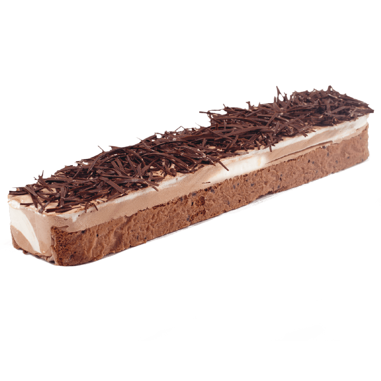 Longeur met marmer van witte en pure chocolade mousse, chocolade biscuit en chocolade tagliatelle.
