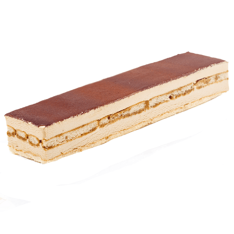 Bande van tiramisu, met koffie getrempeerde lange vingers en beneveld met chocolade.