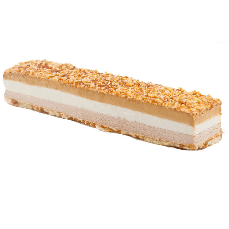 Bande van trio warme smaken roomijs: nougat, karamel en praliné rijkelijk bestrooid met nougatine.