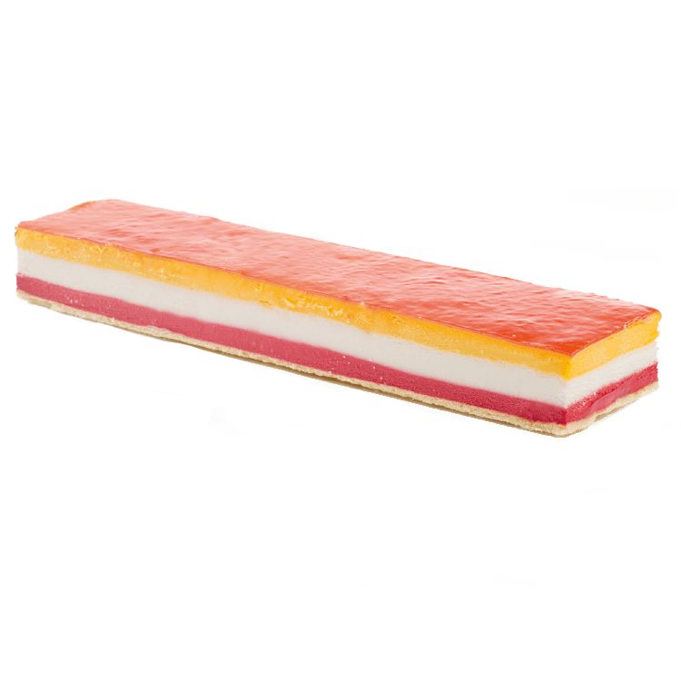 Bande van sorbetijs met het trio frisse smaken: framboos, citroen en mango met frambozen gelei.