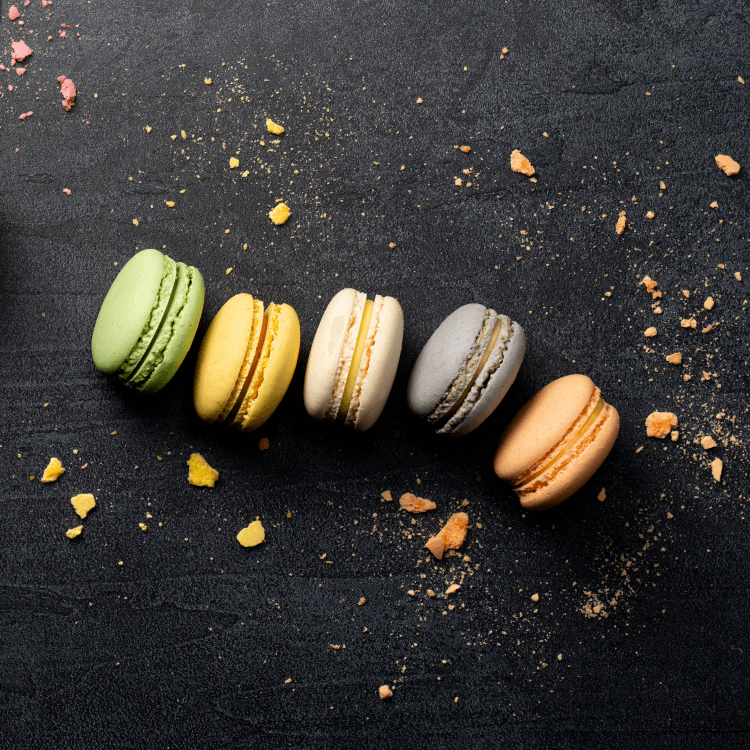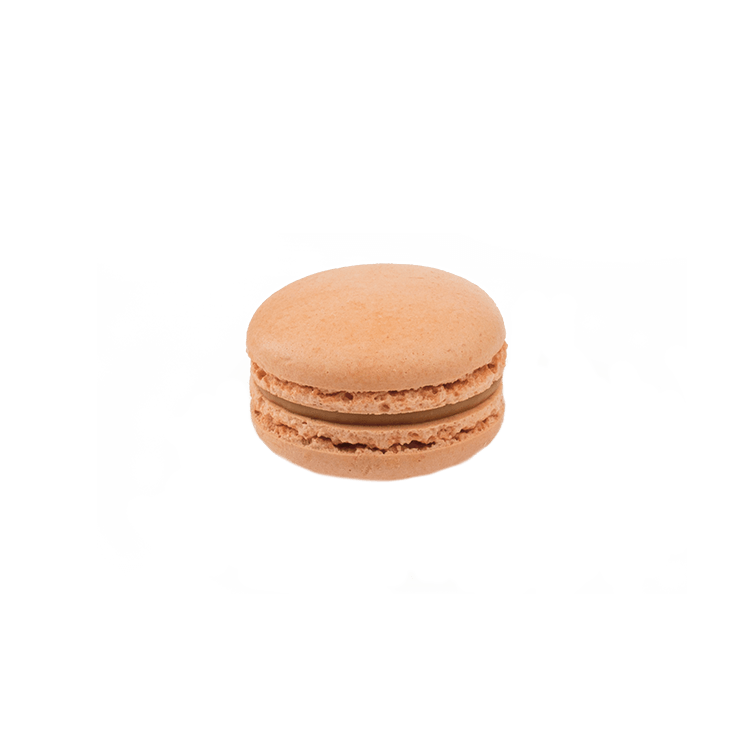 Karamel macaronschelp, vulling is een ganache van gezouten karamel.
