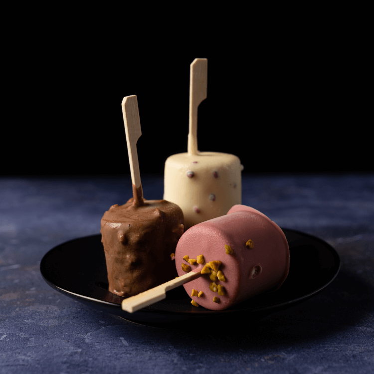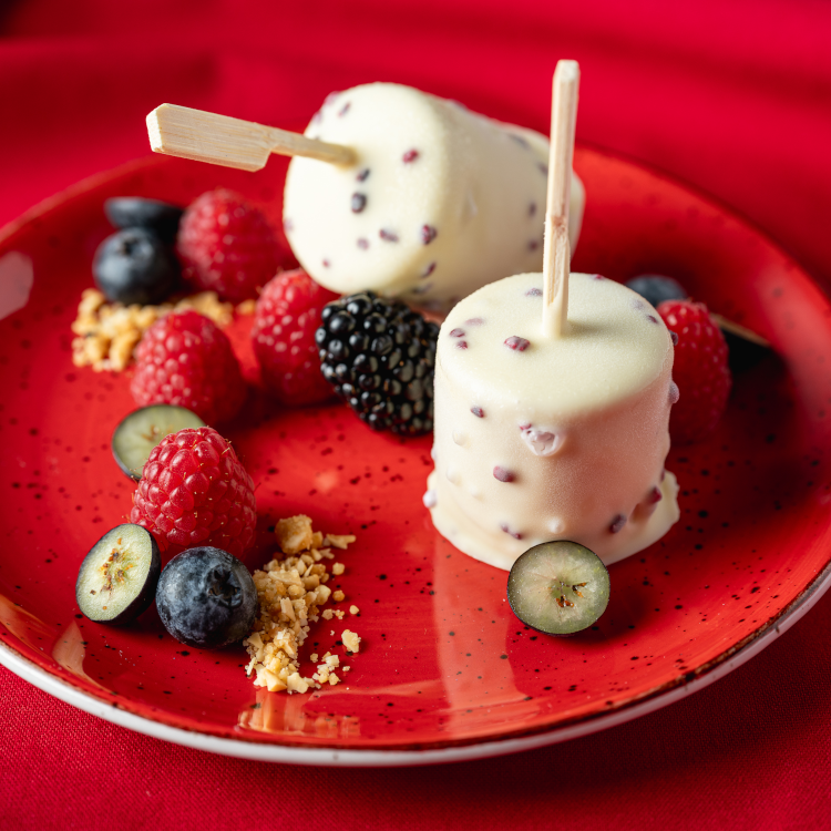 Roodfruit roomijs omhult met witte chocolade van Callebaut en bosvruchtjes.
