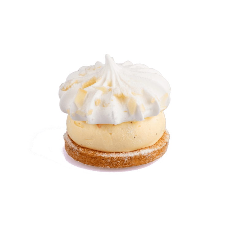 Bodem van krokant deeg, interieur van frambozen met crème au beurre vanille en een swirl van limoenmeringue schuim.