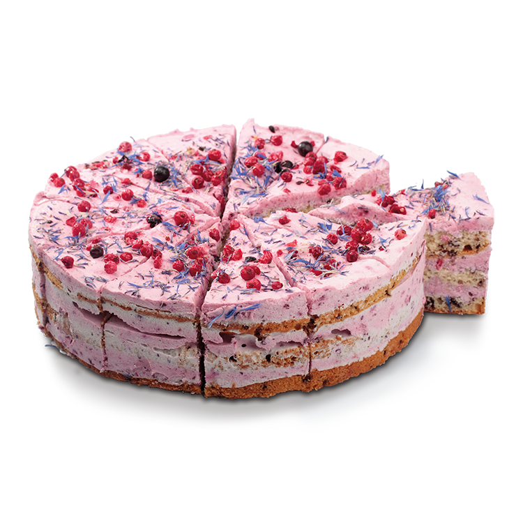 room (room, geleermiddel (carrageen)), cakemix (tarwebloem, suiker, weipoeder (melk), melkpoeder, emulgator(mono- en diglyceriden van vetzuren), rijsmiddelen (difosfaten, natriumcarbonaten), verdikkingsmiddelen (natriumcarboxymethylcellulose, guarpitmeel), zout), (15%) bosvruchten (aardbei, rode bessen, zwarte bessen, bramen, frambozen, bosbessen), ei, water, plantaardige olie (koolzaad), suiker, invertsuiker met honing