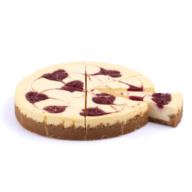 Koekjesbiscuit bodem, cheesecake en swirl van frambozen (gesneden in 12 punten).