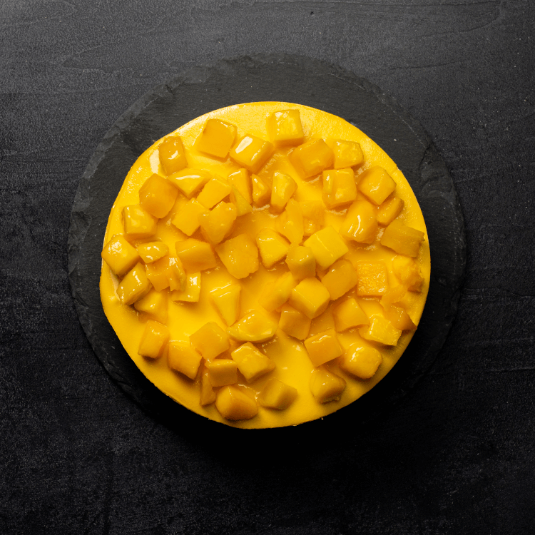 Mango bavarois met pistachebiscuit, rijkelijk gedecoreerd met mango blokjes en mango gelei.