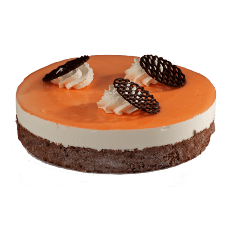 Mascarpone bavarois, chocolade chips biscuit, sinaasappel gelei, slagroom en chocolade decoratie.
