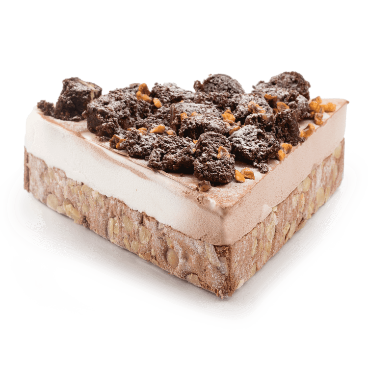 Chocolade roomijs met amandel smaak, gedecoreerd met brownie stukjes en gekarameliseerde stukjes hazelnoot.