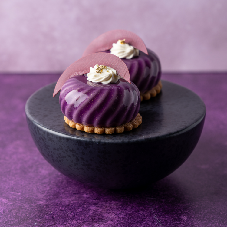 Maak uw dessertkaart Instagrammable: de Purple Sparkling is fotowaardig. Uw gasten zullen dit verwenmoment delen op social media. Bodem van Bretonse koek, compote van pruimen met acai en een mousse van mascarpone. Het dessert is luxe gedecoreerd met een toefje kookroom, eetbaar bladgoud en een halve maan van chocolade.