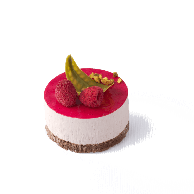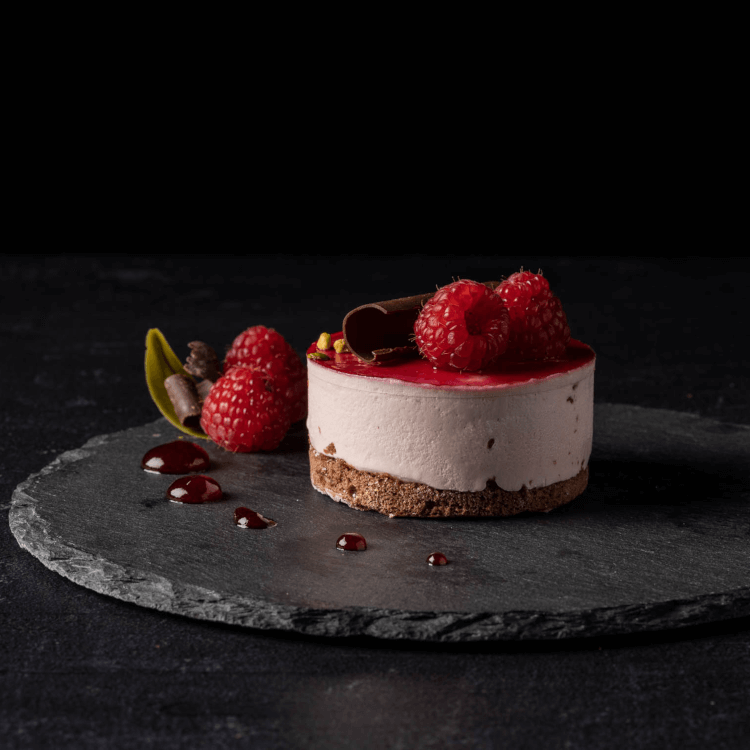 Dessert van frambozen bavarois met een bodem van chocolade – amandelbiscuit. Luxe gedecoreerd met chocolade, frambozen en pistache noten. Deze allemansvriend is een hardloper op iedere dessertkaart.