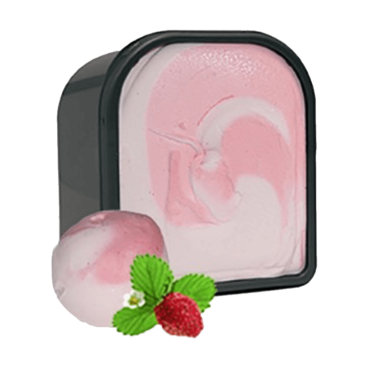 Marmer van het beste aardbeien sorbet- en roomijs. Het kleurverschil in het ijs zorgt voor een ambachtelijke uitstraling en zorgt ervoor dat iedere bol anders is.