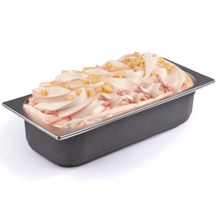 Roomijs strawberry-cheesecake, de volle smaak van cheesecake roomijs met garnituur van stukjes koek en een frisse aardbeiensaus.