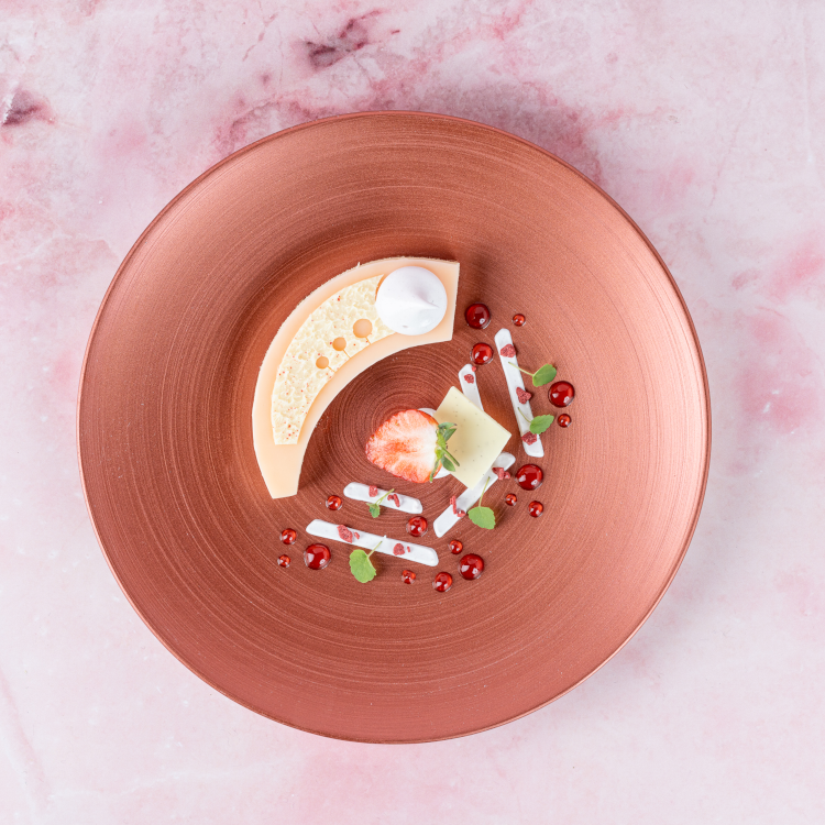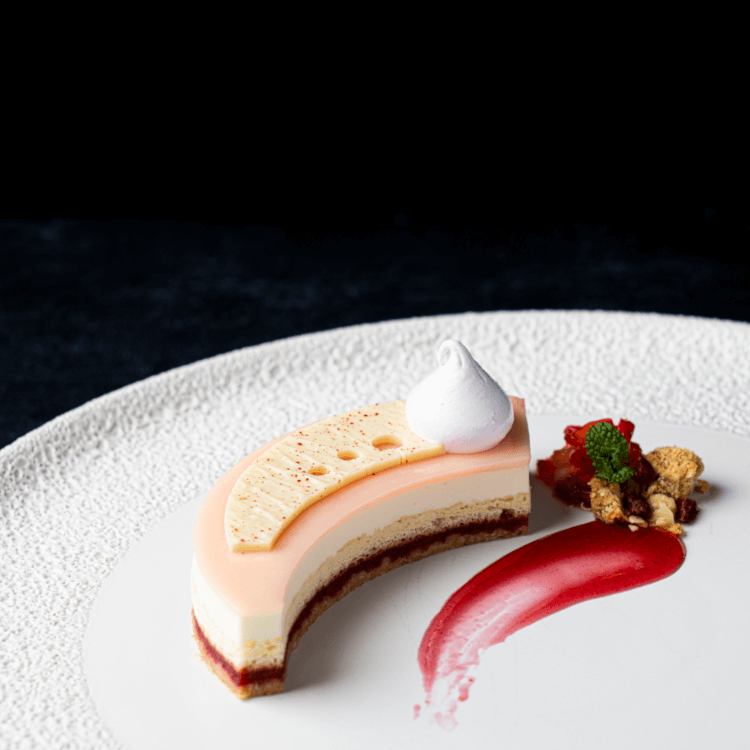 Vertel het verhaal achter een dessert. Onze patissiers zijn geïnspireerd door de Strawberry Moon. Een volle maan midden in het aardbeien seizoen die volledig roze kleurt. Het dessert gemaakt op een bodem van yoghurt feuilletine met daarop een compote van aardbeien, een mousse van kalamansi, duchesse biscuit en luxe gedecoreerd met witte chocolade en een meringue van aardbei.