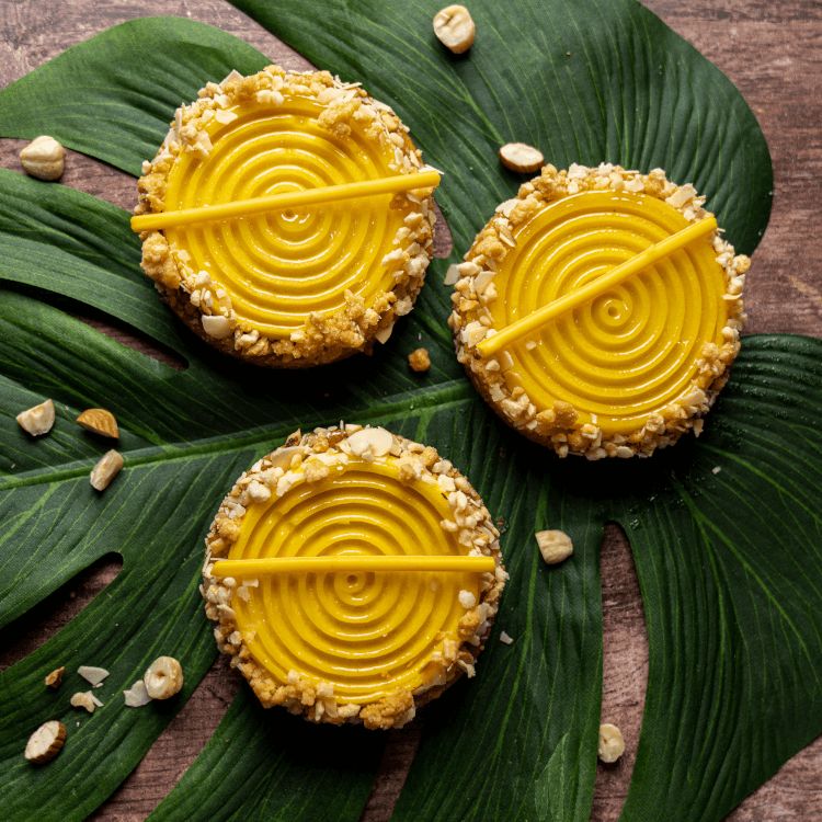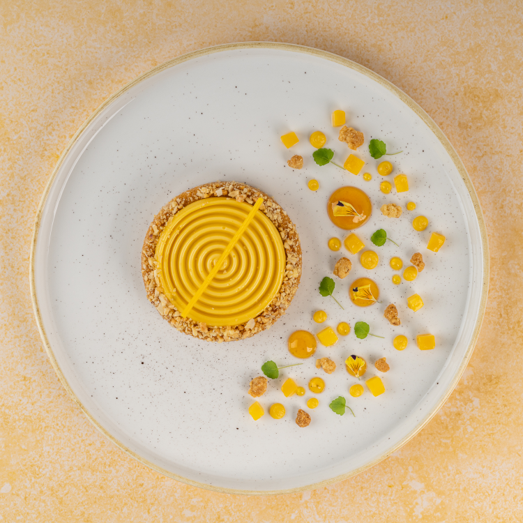Tartelette van Bretons deeg en hazelnoot frangipane met een marmelade van ananas en panna cotta van passievrucht en mango, aangezet met hazelnootjes.