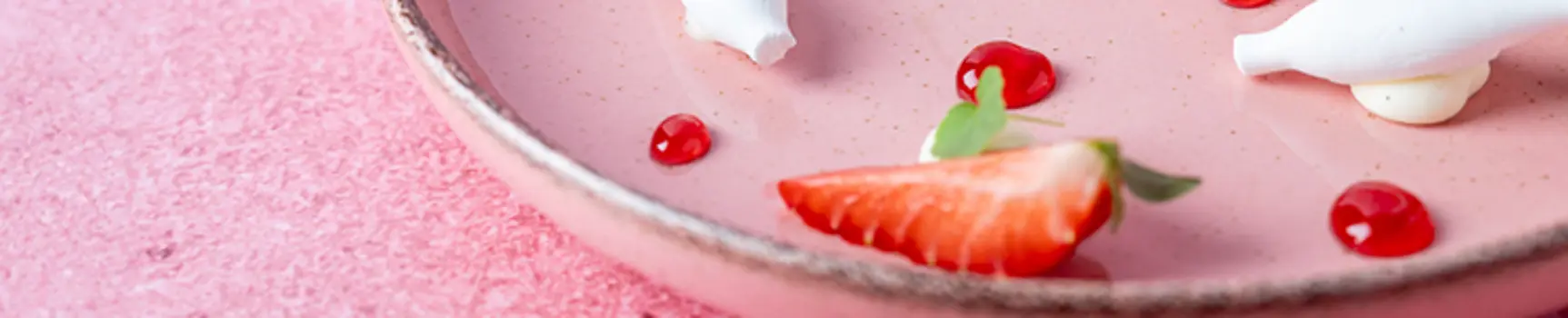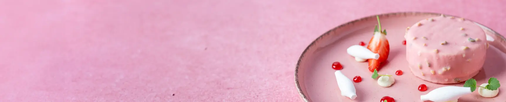 Vertel het verhaal achter een dessert. Onze patissiers zijn geïnspireerd door de Strawberry Moon. Een volle maan midden in het aardbeien seizoen die volledig roze kleurt. Het dessert gemaakt op een bodem van yoghurt feuilletine met daarop een compote van aardbeien, een mousse van kalamansi, duchesse biscuit en luxe gedecoreerd met witte chocolade en een meringue van aardbei.